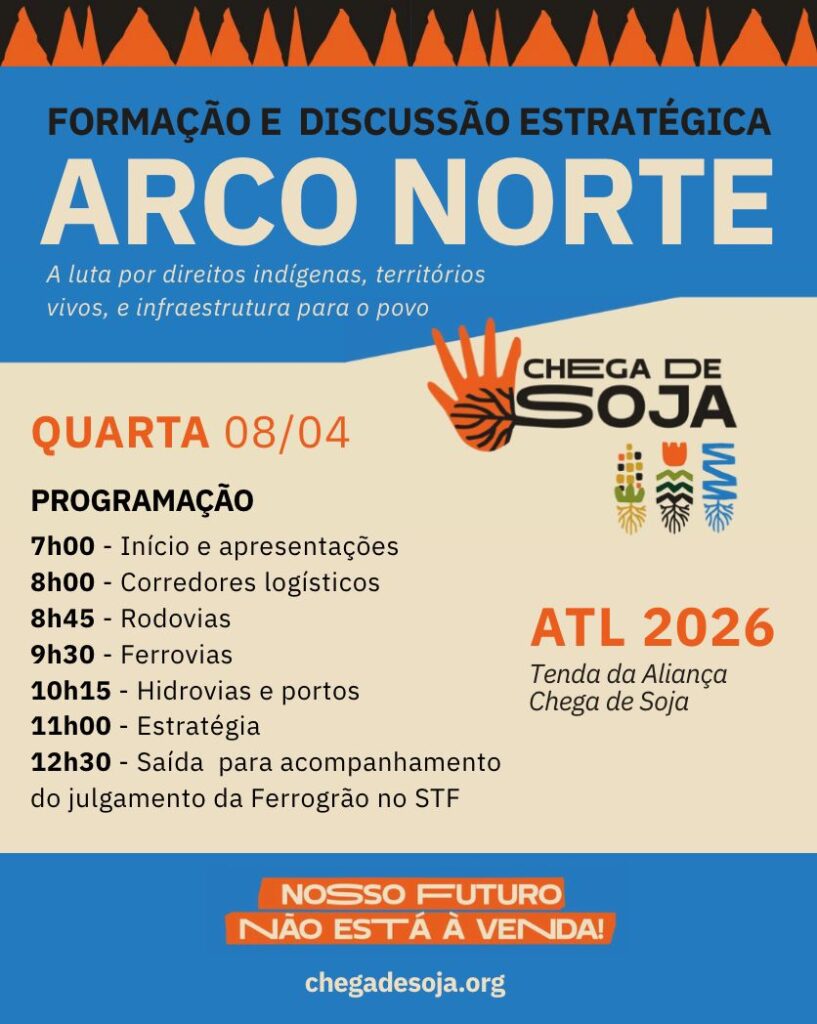 Os impactos socioambientais e as violações de direitos associadas à expansão do Arco Norte estarão no centro de um encontro de formação e intercâmbio no dia 8 de abril, durante o Acampamento Terra Livre (ATL) em Brasília. A atividade, realizada pela Aliança Chega de Soja, reúne organizações da sociedade civil e representantes de territórios para discutir os efeitos da infraestrutura logística na Amazônia e fortalecer estratégias de incidência no planejamento do setor.